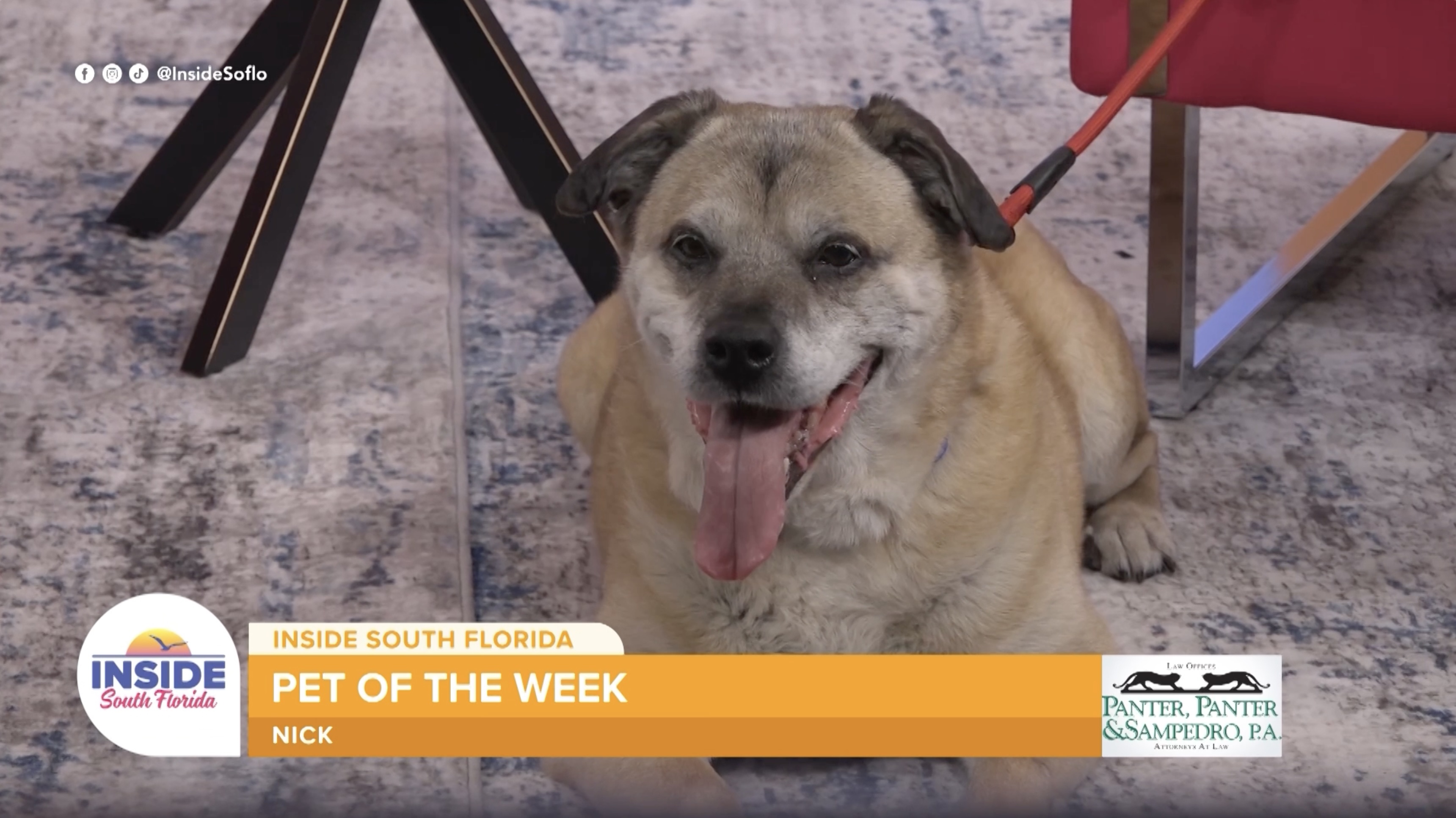 Nick, estimated to be about 7 years old, joined Inside South Florida as Pet of the Week, sponsored by Panther and San Pedro, alongside Humane Society Broward County representative Cherie Wachter. He made himself right at home on set — sniffing around, finding the cool tile floor, and charming everyone in the studio with his curly tail and gentle demeanor.